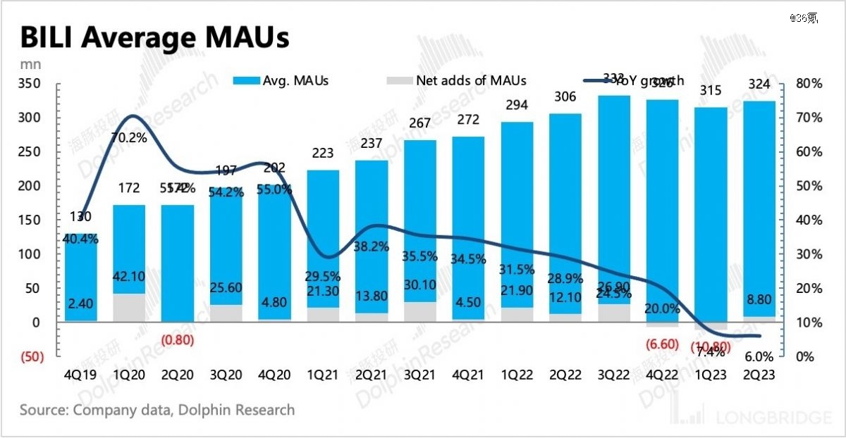 營(yíng)銷開支的減少也帶來(lái)了用戶增速的放緩。本季度,B站月均活躍用戶數(shù)達(dá)3.24億,同比增長(zhǎng)6%,增速為歷年來(lái)*水平。去年同期的增速是28.9%。