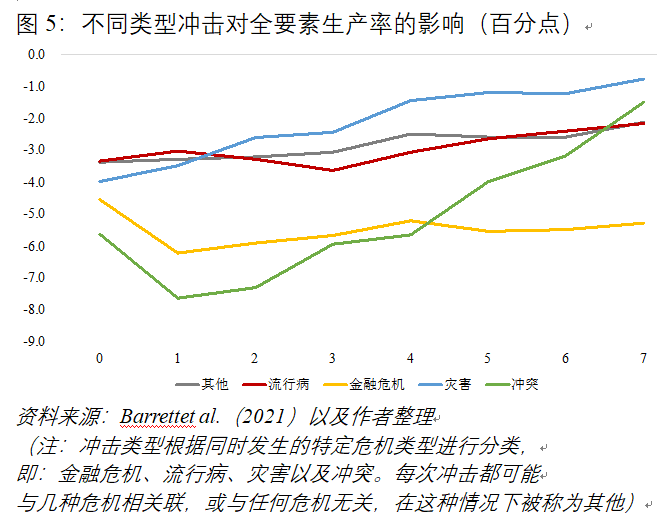 過去經(jīng)濟(jì)沖擊造成疤痕效應(yīng)主要是由持續(xù)疲軟的生產(chǎn)力,特別是全要素生產(chǎn)率下降造成中長期的影響。對比可能引發(fā)經(jīng)濟(jì)衰退的幾種沖擊:金融危機(jī)、流行病、災(zāi)害以及沖突,利用歷史數(shù)據(jù)計(jì)算這些因素對于全要素生產(chǎn)率的影響,實(shí)證結(jié)果顯示,由流行病引發(fā)的經(jīng)濟(jì)衰退對于全要素生產(chǎn)率的影響短期較小,且中長期后逐漸消退。