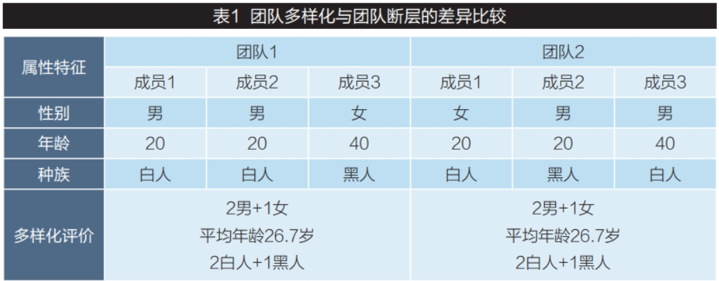 Lau和Murnighan給定的如下情境更能詳細闡釋“斷層”與“多樣化”的異同。假設(shè)一個團隊有以下兩種組成狀況,一是有兩個20歲的男性白人以及一個40歲女性黑人;二是有一個20歲的女性白人、一個20歲的男性黑人和一個40歲的男性白人(見表1)。
