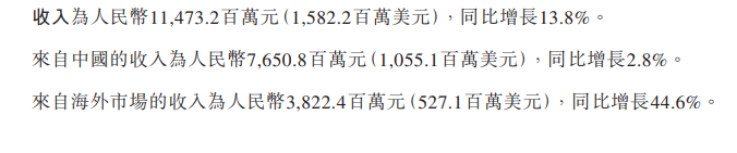 從收入方面來看,中國市場的收入達(dá)到76.50億元,同比增長了2.8%。而來自海外市場的收入則達(dá)到了38.22億元,同比增長了44.6%。