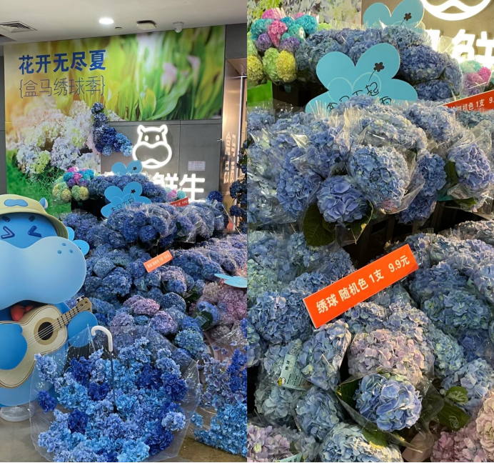 剁主注意到,從去年開(kāi)始,盒馬就有了有更多差異化繡球品種出現(xiàn),比如今夏上新的莫奈、孔雀、吸色繡球等,在線上APP、線下門店中占據(jù)“C位”。