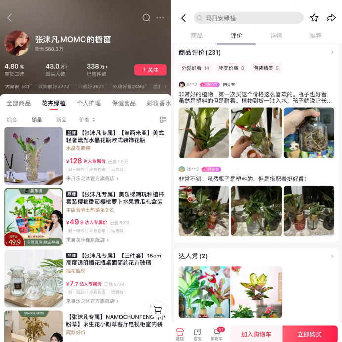 達(dá)人多余和毛毛姐的直播間,選擇了將綠植、鮮花、福利品、云南水果搭配,平均在線3萬(wàn)人,鮮花綠植總訂單量突破12萬(wàn);明星戚薇將發(fā)財(cái)樹(shù)、玫瑰引入七夕美妝專場(chǎng),單場(chǎng)銷售突破2萬(wàn)單。