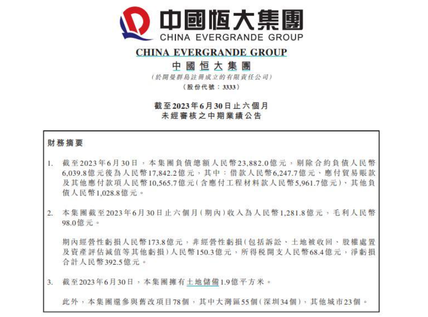 截至2023年6月30日止六個月收入為1281.8億元,毛利98億元;同期經(jīng)營性虧損173.8億元,非經(jīng)營性虧損150.3億元,凈虧損合計392.5億元。截至2023年6月30日,集團擁有土地儲備1.9億平方米。此外,集團還參與舊改項目78個,其中大灣區(qū)55個,其他城市23個。