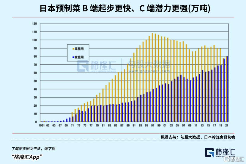 經(jīng)濟擴張推動著日本城鎮(zhèn)化迅速轉(zhuǎn)型,外出就餐成為新風尚,B端預制菜加速滲透,直至經(jīng)濟泡沫的影響反映到餐飲業(yè),隨后對于預制菜的銷量由C端注重快捷烹飪、方便囤積的需求接棒。