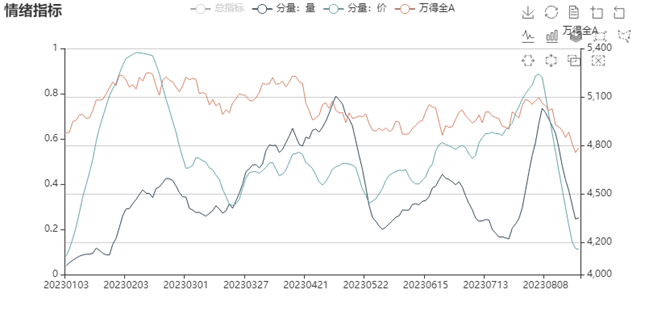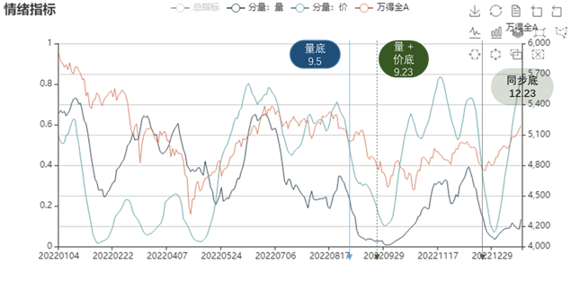 那么這個(gè)指標(biāo),現(xiàn)在如何?當(dāng)下,是一個(gè)近似去年12月下旬的底部狀態(tài)。雖然嚴(yán)格意義說,“量”尚未萎縮至20%,但也并無非常大的區(qū)別。而放眼2023年,近期已經(jīng)是情緒指標(biāo)整體最低的一個(gè)階段。因此,就“是否進(jìn)入一個(gè)可嘗試的左側(cè)”這個(gè)問題,情緒的答案是肯定的。