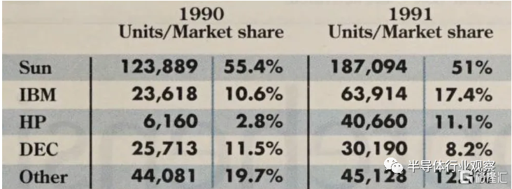 我們可以將 1990 年和 1991 年 Unix 工作站市場的銷量(來源 Computerworld)與 IBM PC 兼容銷量進(jìn)行比較,1990 年 IBM PC 兼容銷量超過 1500 萬臺: