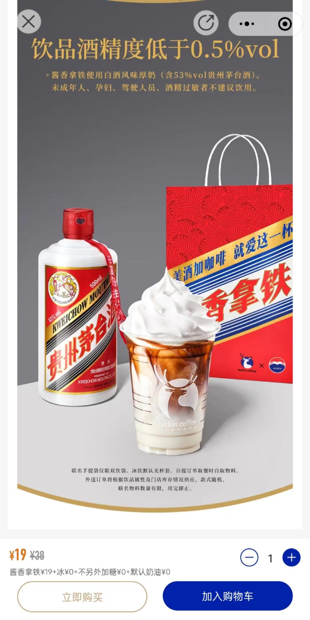 財聯(lián)社9月4日訊,今日,瑞幸咖啡與貴州茅臺推出的聯(lián)名咖啡“醬香拿鐵”正式上市,零售價38元/杯,使用相關(guān)優(yōu)惠券后到手價約19元/杯。據(jù)介紹,醬香拿鐵使用白酒風(fēng)味厚奶(含53%vol貴州茅臺酒) ,飲品酒精度低于0.5%vol,未成年人、孕婦、駕駛?cè)藛T、酒精過敏者不建議飲用。