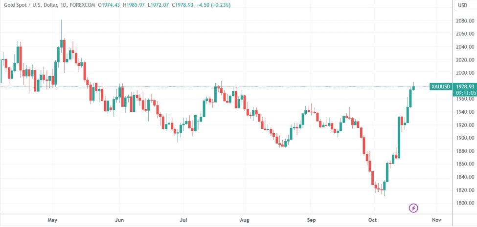 財(cái)聯(lián)社10月20日訊與上周五一樣,金融市場擔(dān)憂周末休市期間可能出現(xiàn)的宏觀不確定性,美股期指盤前震蕩走弱,黃金、原油延續(xù)漲勢(shì)。其中黃金現(xiàn)貨從10月7日至今,已經(jīng)從1830美元漲至1980美元/盎司。