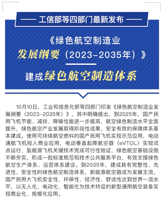 10月10日,工業(yè)和信息化部等四部門(mén)印發(fā)《綠色航空制造業(yè)發(fā)展綱要(2023-2035年)》,其中明確提出,到2025年,國(guó)產(chǎn)民用飛機(jī)節(jié)能、減排、降噪性能進(jìn)一步提高,航空綠色制造水平全面提升;到2035年,建成具有完整性、先進(jìn)性、安全性的綠色航空制造體系等。