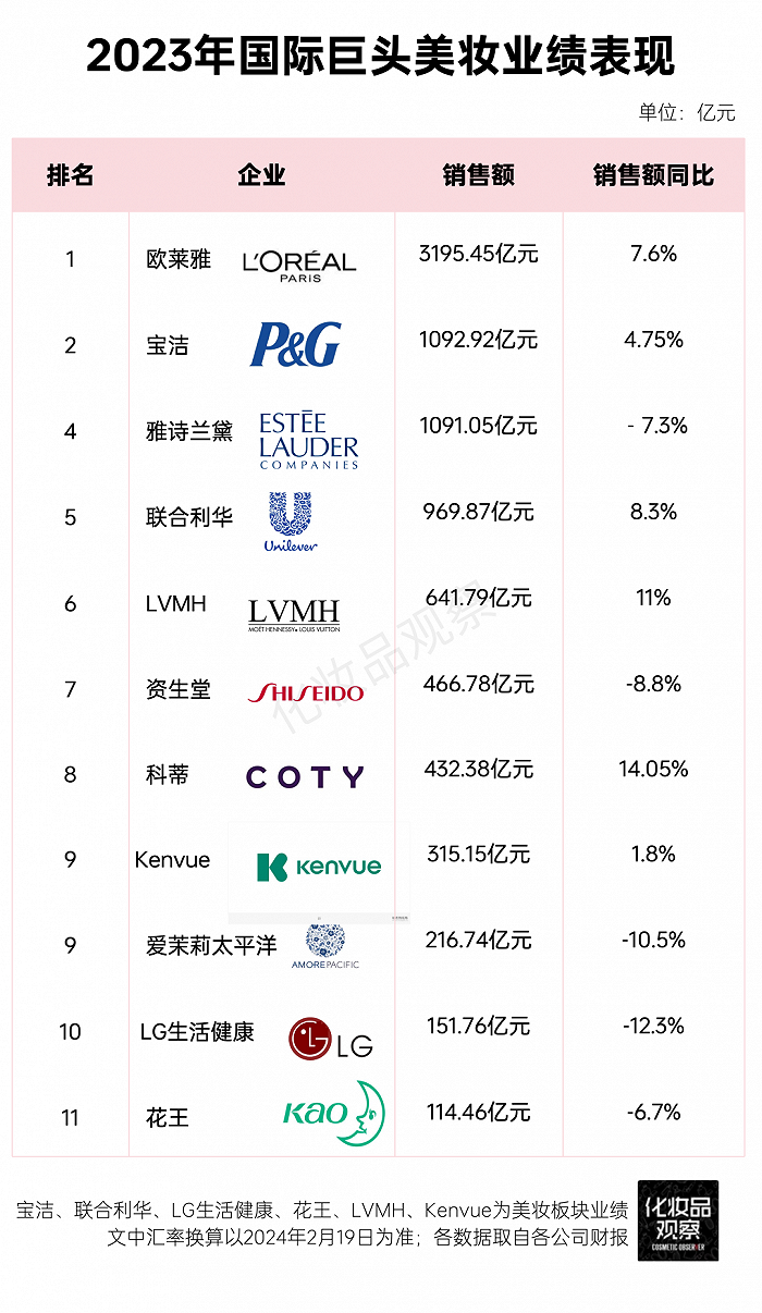 2023年,十一大國際巨頭美妝業(yè)務總銷售額達8700億元人民幣,較2022年同期增長4.6%。