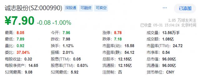 截至 5 月 31 日收盤(pán),誠(chéng)志股份股價(jià)下跌 1%,報(bào) 7.9 元,總市值為 96 億元。