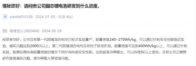 瑞財(cái)經(jīng) 鐘鳴辰 5 月 29 日本,贛鋒鋰業(yè)(002460)在社交平臺上表示,目前公司第一代固液混合電池已初步量產(chǎn),能量密度已初步實(shí)現(xiàn)。 240~270Wh/kg,可通過針刺安全性能測試,循環(huán)次數(shù)達(dá)到 2000 第二代固液混合電池目前正處于研發(fā)階段,能量密度可達(dá)到 400Wh/kg 上述,可通過針刺試驗(yàn),能在保持高能密度的同時(shí)保持高安全性,達(dá)到極高的功率輸出,能持續(xù)保持高能密度, 5C 上述放電,目前公司正專注于提高循環(huán)次數(shù)、大功率輸入等方面的研究。