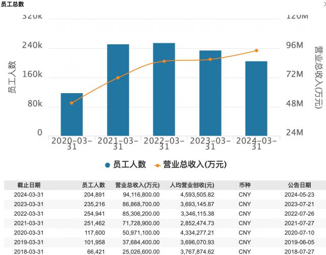 不同于JD.COM和拼多多逐年擴(kuò)大員工規(guī)模, 2022 年—— 2023 在過(guò)去的幾年里,阿里的員工總數(shù)開(kāi)始下降。據(jù) wind 數(shù)據(jù),2022 年 3 月底—— 2024 年 3 月底,阿里向大眾輸送了超級(jí)運(yùn)輸。 5 萬(wàn)的“大廠人”,也為博主跑道的辭職做出了一定的貢獻(xiàn)。截至今年 3 月末,阿里的員工總數(shù)約為 20.5 萬(wàn)。