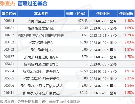 張宜杰先生:中國國藉,研究生。2016 年 7 月至 2021 年 12 每月在博時基金管理有限公司工作,任交易部高級交易員 ;2021 年 12 月至 2022 年 10 每月在招商局證券資產(chǎn)管理有限公司工作,擔(dān)任固定收益投資部投資經(jīng)理 ;2022 年 11 每月加入招商基金管理有限公司。2023 年 8 月 8 日起擔(dān)任招商招金寶貨幣市場基金主管,招商招財通理財債券型證券投資基金主管。目前正在招商定期寶六個月期理財債券型證券投資基金經(jīng)理。2023 年 12 月 29 每天都是招商添文 1 年度債券型發(fā)起式證券基金基金經(jīng)理定期開放。2024 年 1 月 9 每日擔(dān)任招商招盛純債券型證券投資基金,招商增潤, 3 債券型發(fā)起式證券基金基金經(jīng)理每月定期開放。2024 年 2 月 2 每天都是招商招鴻 6 債券型發(fā)起式證券基金基金經(jīng)理每月定期開放。
