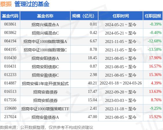 蔡振先生:中國(guó)國(guó)家,研究生,碩士。2014 年 7 每月加入招商基金管理有限公司量化投資部,曾任招商基金管理有限公司 ETF 主要從事量化投資策略研究的專員、研究人員。目前招商安陽債券型證券投資基金主管基金 ( 管理時(shí)間:2021 年 8 月 5 日至今 ) 、招商安盈債券型證券投資基金主管基金 ( 管理時(shí)間:2021 年 8 月 5 日至今 ) 、招商中證 1000 指數(shù)強(qiáng)化型證券投資基金主管基金 ( 管理時(shí)間:2021 年 11 月 5 日至今 ) 、招商安福 1 每年定期開放債券型發(fā)起式證券投資基金主管基金 ( 管理時(shí)間:2022 年 1 月 18 日至 2024 年 3 月 26 日 ) 。招商安嘉債券型證券投資基金主管基金 ( 管理時(shí)間:2022 年 9 月 20 日至今 ) 。招商安嘉債券型證券投資基金主管基金 ( 管理時(shí)間:2022 年 9 月 20 日至今 ) 。招商中證 1000 增強(qiáng)戰(zhàn)略交易型開放式指數(shù)證券投資基金主管基金 ( 管理時(shí)間:2022 年 11 月 18 日至今 ) 。招商安凱債券型證券投資基金主管基金 ( 管理時(shí)間:2023 年 3 月 3 日至今 ) 。2024 年 5 月 21 日起擔(dān)任招商興福混合型證券投資基金基金主管。