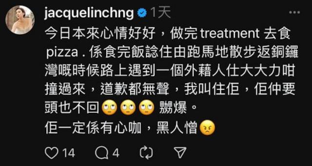 沒(méi)想到莊思敏最近在社交網(wǎng)絡(luò)上公開自己懷疑被當(dāng)街非禮的經(jīng)歷,她生氣地說(shuō):今天原本心情很好,做完了, Treatment 去吃 Pizza,晚飯后,當(dāng)我準(zhǔn)備從賽馬上散步到銅鑼灣時(shí),我在路上遇到了一個(gè)外國(guó)人,他沒(méi)有道歉。我攔住了他,他的頭也不會(huì)。他一定有心!令人討厭!