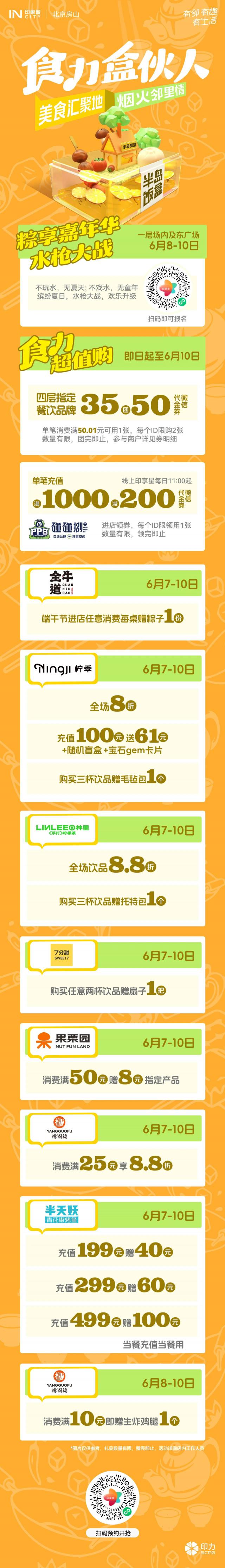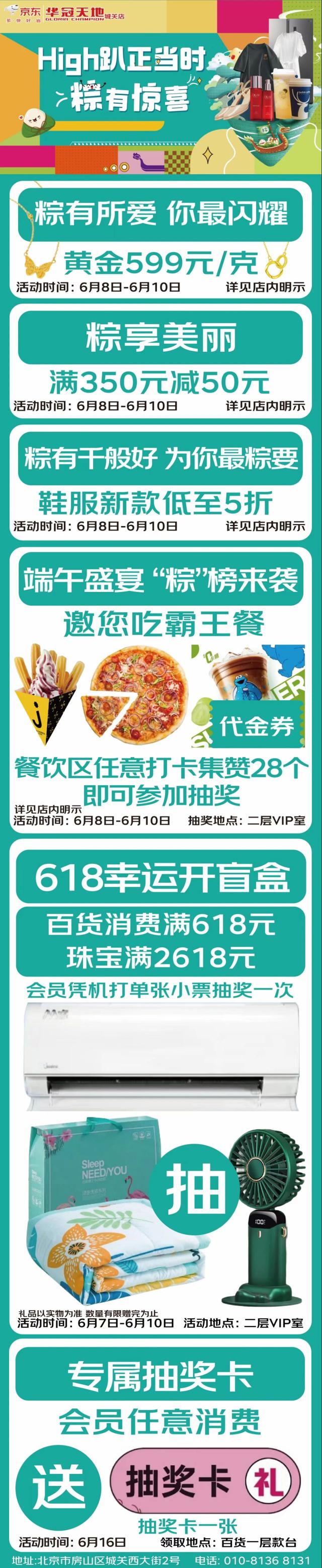 多家購物中心聯(lián)合舉辦,如華冠購物中心店、房山城關(guān)店、房山歡樂城、燕山藍騰店等。 High 就在那個時候。推出整個購物禮品、端午節(jié)家庭互動和 DIY 活動,還有端午禮品入店免費領(lǐng)取,在餐飲區(qū)舉行。 59 團 100 元素,特色美食套餐,用餐送粽子活動等豐富活動。