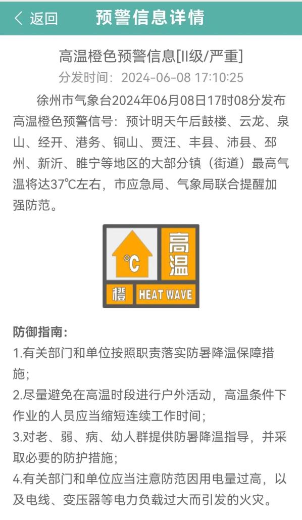 2024年6月8日17時08分,徐州市氣象臺發(fā)布高溫橙色預警信號:預計今天下午鼓樓、云龍、泉山、經(jīng)濟開發(fā)、港務(wù)、銅山、賈汪、豐縣、沛縣、淞州、新沂、兗寧等地區(qū)大部分城鎮(zhèn)(街道)最高氣溫將達到37℃左右,市應(yīng)急局、氣象局聯(lián)合提示加強預防。