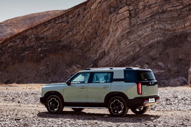 從側(cè)面看,仍然是方盒形狀,車身多處采用直線元素,頂部配有車頂行李架,同時(shí)還采用了懸掛式車頂,L 型 C 柱和隱藏式 D 柱子等設(shè)計(jì)。下面還有黑化處理的輪眉和五幅輪轂,突出了硬核,同時(shí)也融入了許多流行元素。