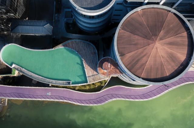 她的游泳池非常受歡迎,是面向新安江的無限游泳池。這條紫色的游泳池就是紫薯綠道。