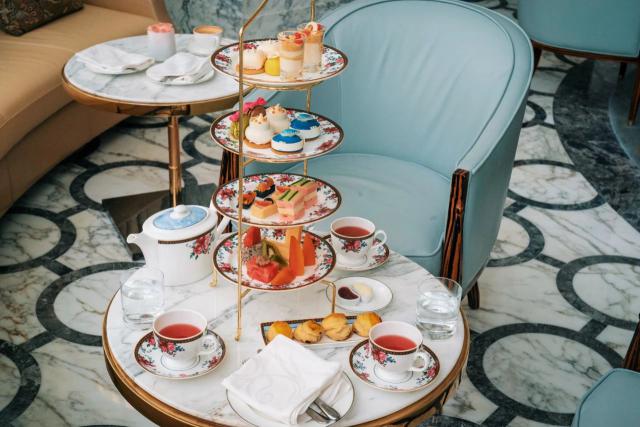 我也推薦朗廷的下午茶。使用的所有容器都是專門為朗廷定制的Wedgwood?!綥angham Rose】款。