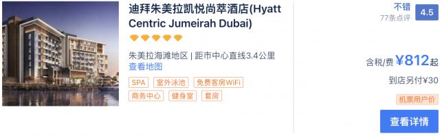 迪拜朱美拉凱悅尚萃海景陽臺房2晚不含早,1159元;2晚含早,1579元