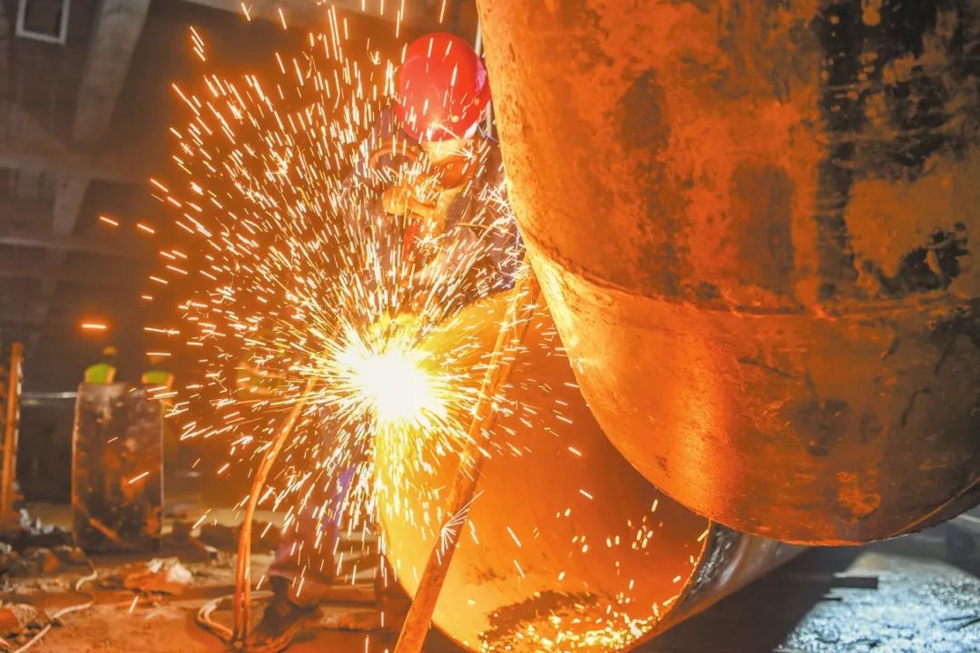 施工人員正在江東新區(qū)高質(zhì)量飲用水廠工程現(xiàn)場焊接輸水管道。記者 孫士杰 攝
