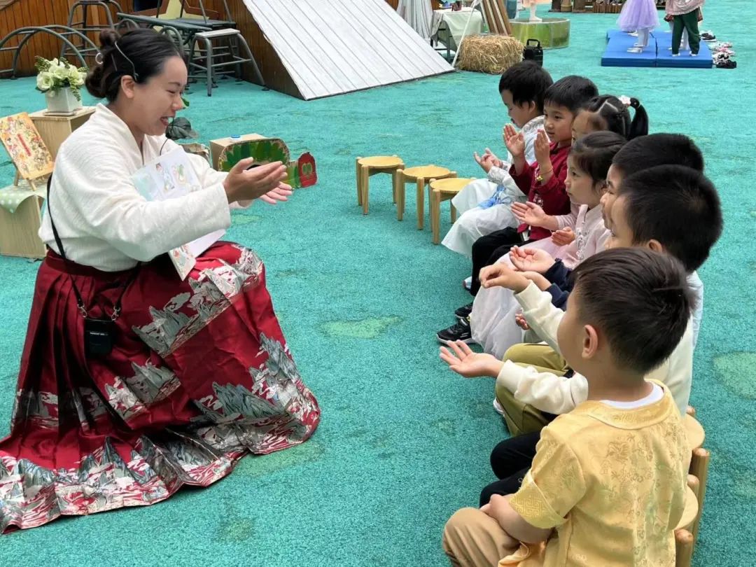 在操場上,中產(chǎn)階級的孩子們圍坐在一起,老師們生動地講述了端午節(jié)的繪本故事。孩子們隨著故事?lián)u頭,仿佛和古人一起感受端午節(jié)的魅力。