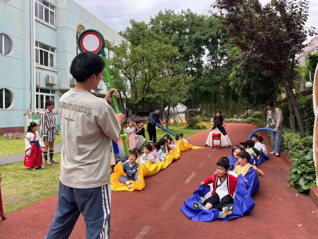 南方操場是托兒所孩子的世界。他們玩了一個除五毒的游戲,把手中的海洋球投向了“五毒”,這意味著驅(qū)逐淘氣,迎接好運。劃龍舟比賽讓孩子們興奮不已。他們齊心協(xié)力,一起滑動“龍舟”,體驗團隊合作的力量。
