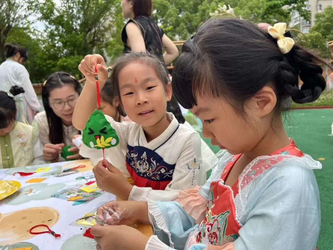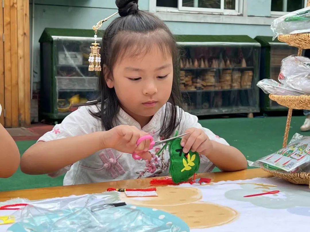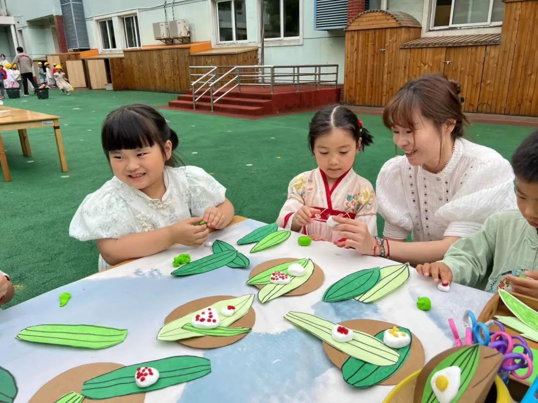 在北操場上,大班的孩子們展示了他們的聰明才智和智慧。端午節(jié)文化,我們在制作手工粽子、香包、彩繩和端午節(jié)花束時,不僅是對屈原的紀念,也是對傳統(tǒng)文化的傳承和發(fā)展。
