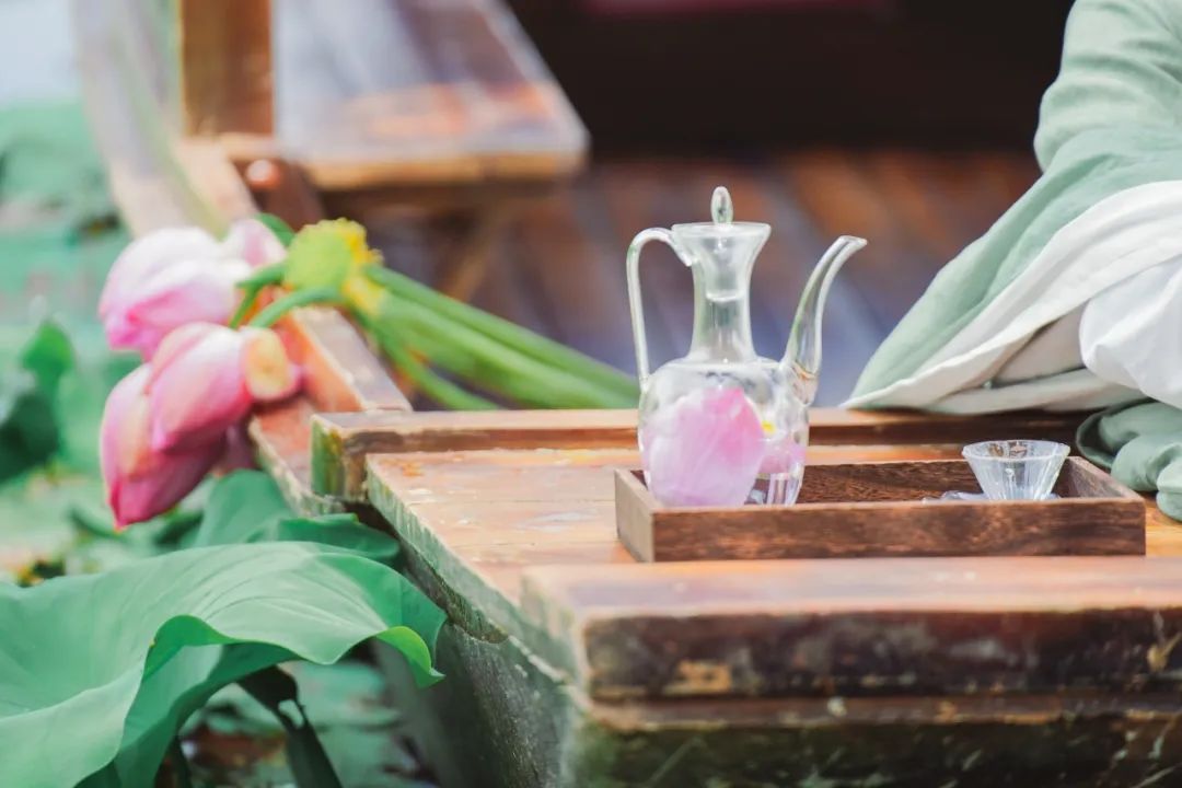 人們?cè)诤芍杏?,花映游客面?duì)面