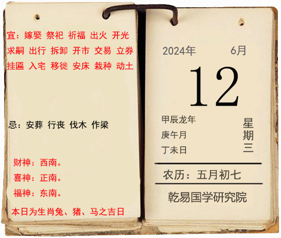 一、時(shí)間:陽(yáng)歷:2024年6月12日;陰歷:【龍年】五月初七;年次:甲辰龍年 庚午月 丁未日。