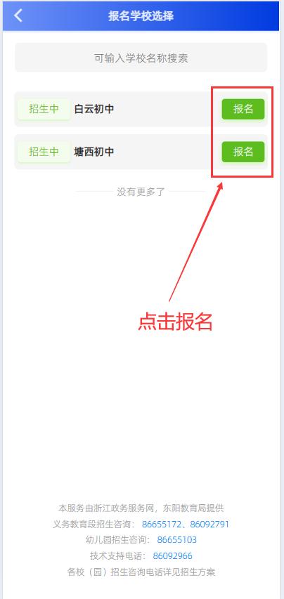 手機登錄“浙里辦”APP,在應用首頁搜索“東陽新生報名”。