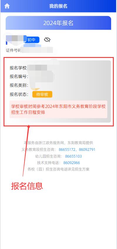 10.注冊成功后,可以點擊“我的注冊”查看注冊結果。不同學校的審批時間不同。請結合《東陽市2024年義務教育階段學校招生時間表》等待學校審批。