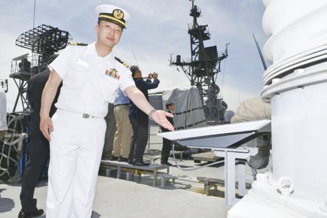 自衛(wèi)隊官員展示艦上的“星鏈”天線。