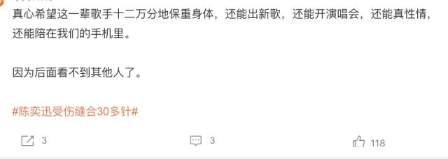 陳奕迅跌傷后續(xù),下頜縫30針基本可以恢復(fù),兩天不能吃飯和說(shuō)話。