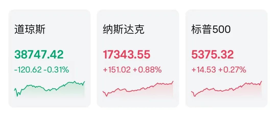 截至收盤,標準普爾500指數(shù)上漲0.27%,報告5375.32點;納斯達克綜合指數(shù)上漲0.88%,報告17343.55點,均刷新前一天的新高;道瓊斯指數(shù)下跌0.31%,下跌120.62點,報告38747.42點。