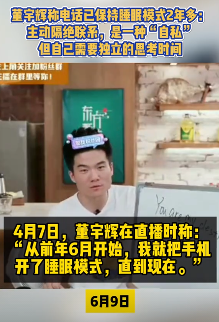 今年4月,董宇輝在直播間提到,從2022年6月開始,他的手機(jī)已經(jīng)連續(xù)兩年開始睡眠模式。他試圖在繁忙的工作和個人生活之間找到一個安靜的地方。