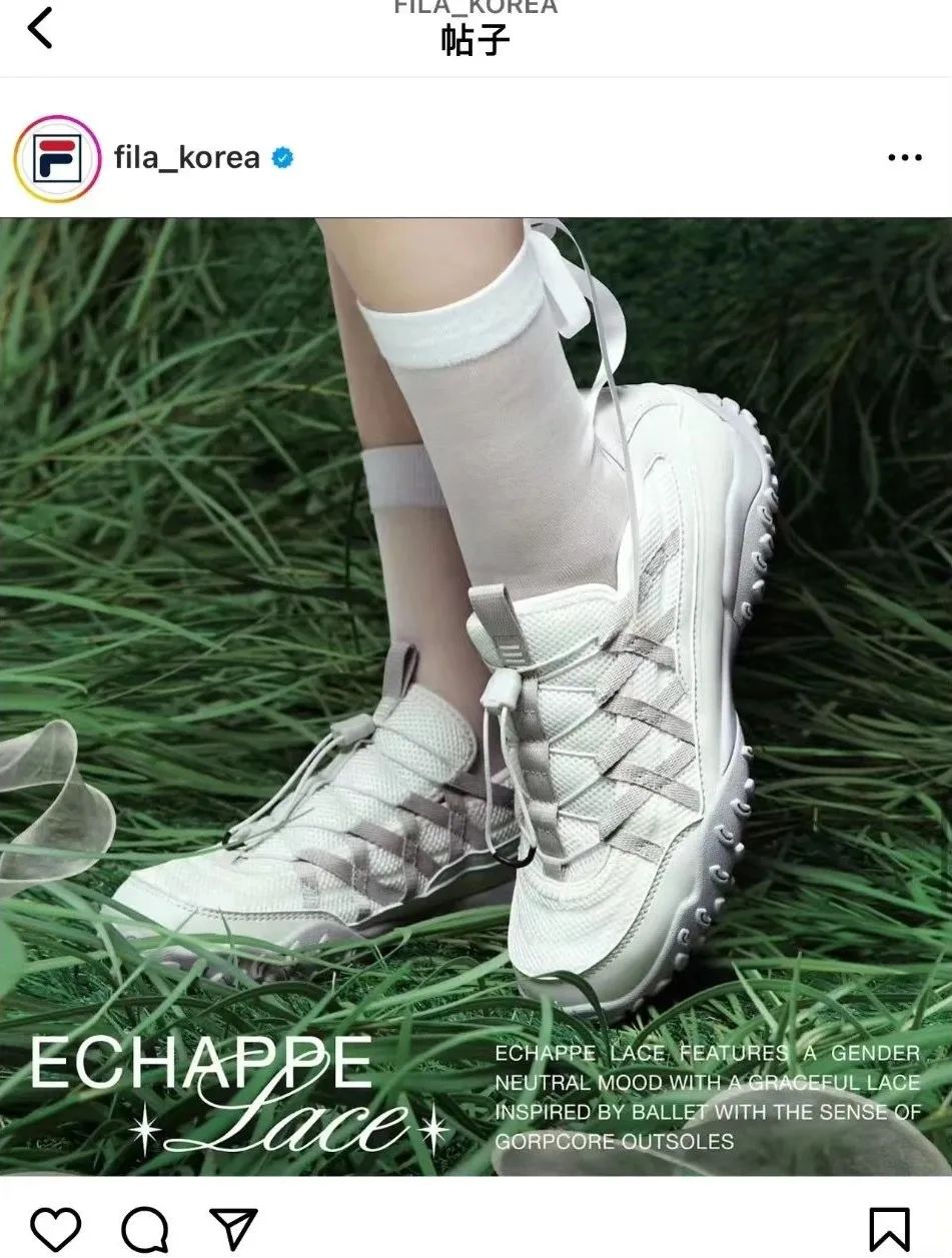 與此同時,斐樂也嗅到了“跨界混搭風格”的商機,在韓國市場推出芭蕾風格功能鞋,并邀請韓素希代言。鞋身為奶油色,表面搭配深粉色綁帶。纖細的鞋底包含登山鞋的顆粒感,工裝褲或裙子的組合充滿了甜蜜和酷炫。一旦推出,就成了社交平臺上的爆款,在采購處加價30%還是很難找到鞋子。