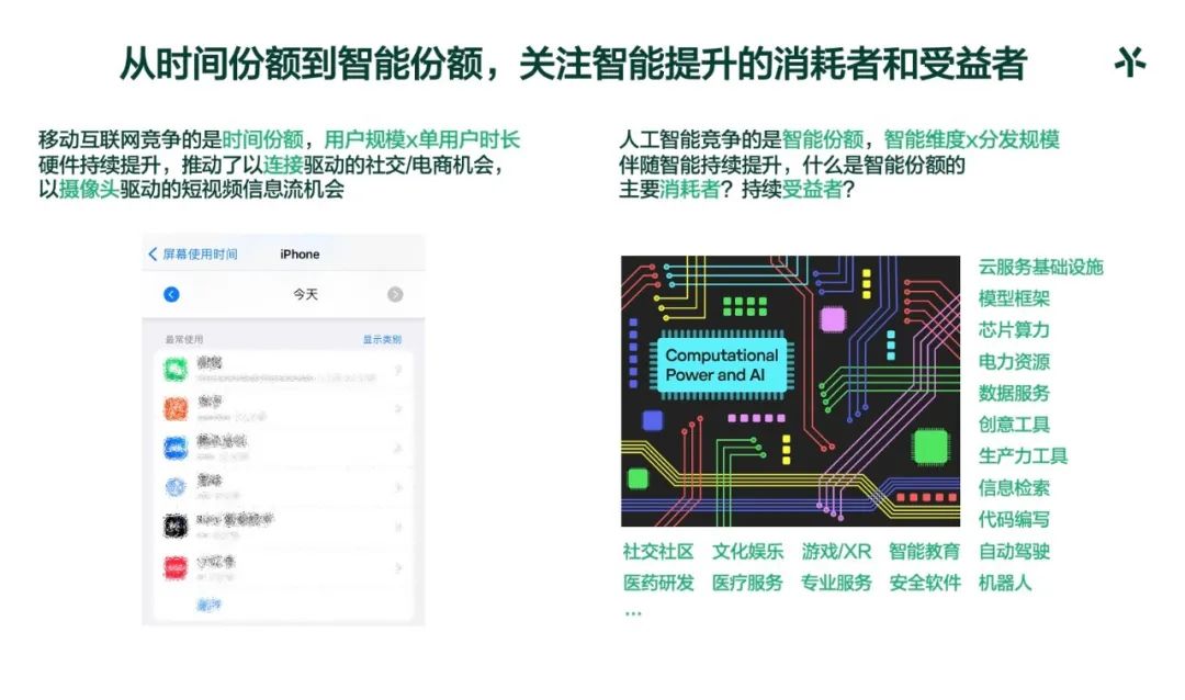 AI時代,用戶人均使用時間進一步增長的空間有限,而智能化的增長潛力是無限的。 未來能夠擁有更多智能份額的企業(yè),將有更多的機會繼續(xù)受益于基礎(chǔ)設(shè)施不斷完善、計算率成本不斷下降、模型能力不斷提升的趨勢。