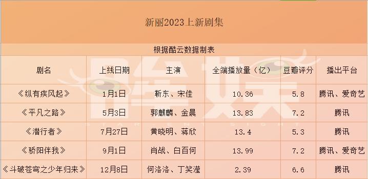 新麗2023全年推出5部新劇,其中央視8部,市場關(guān)注度較高的劇集也不乏。比如肖戰(zhàn)主演的《太陽伴我》,頂流肖戰(zhàn)。、靳東主演的《收視保障》《縱有疾風(fēng)起》、改編自大IP的《打破天空》。新麗作為行業(yè)領(lǐng)袖的影響力和制作能力可以從主題類型、演員卡司、IP熱度、上星數(shù)量等方面看出。