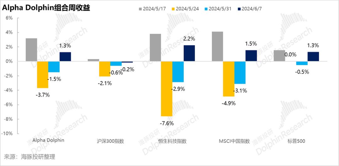 端午節(jié)前后,海豚君沒有調(diào)整倉(cāng)位。上周結(jié)束,組合收入回升1.3%,跑輸MSCI中國(guó)( 恒生技術(shù)指數(shù)1.5%)( 標(biāo)普500,2.2%)( 持平1.3%,但跑贏滬深300(-0.2%)。