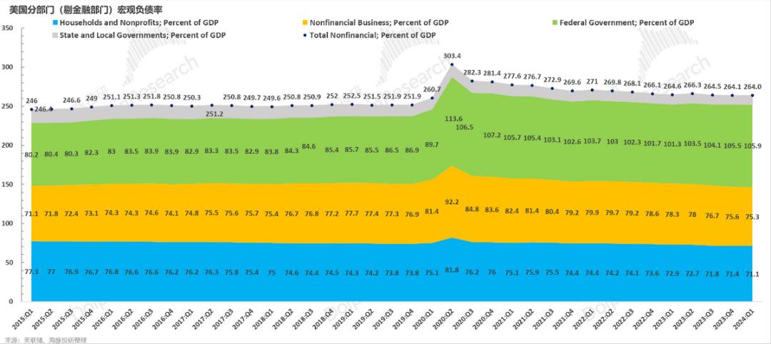 很明顯,從22年第二季度加息周期來看,居民、公司、聯(lián)邦政府和地方政府都在去杠桿化的道路上,但從23年第二季度開始,聯(lián)邦政府開始重新增加杠桿化,到2024年第一季度,杠桿率持續(xù)上升。