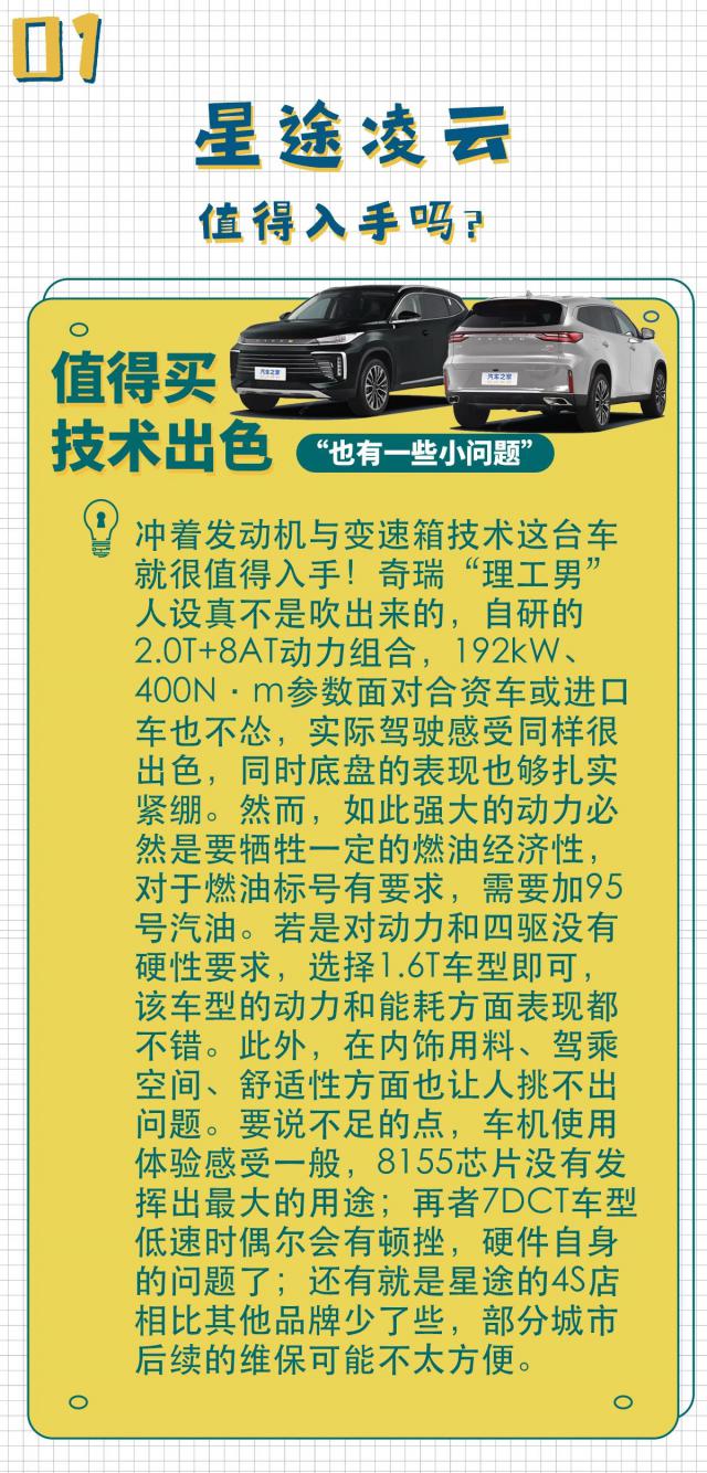 Q1,星途凌云值得入手嗎?值得入手,同價(jià)位下,這款車的機(jī)械質(zhì)量很好,而且配備也很好,只是 4S 商店數(shù)量少。