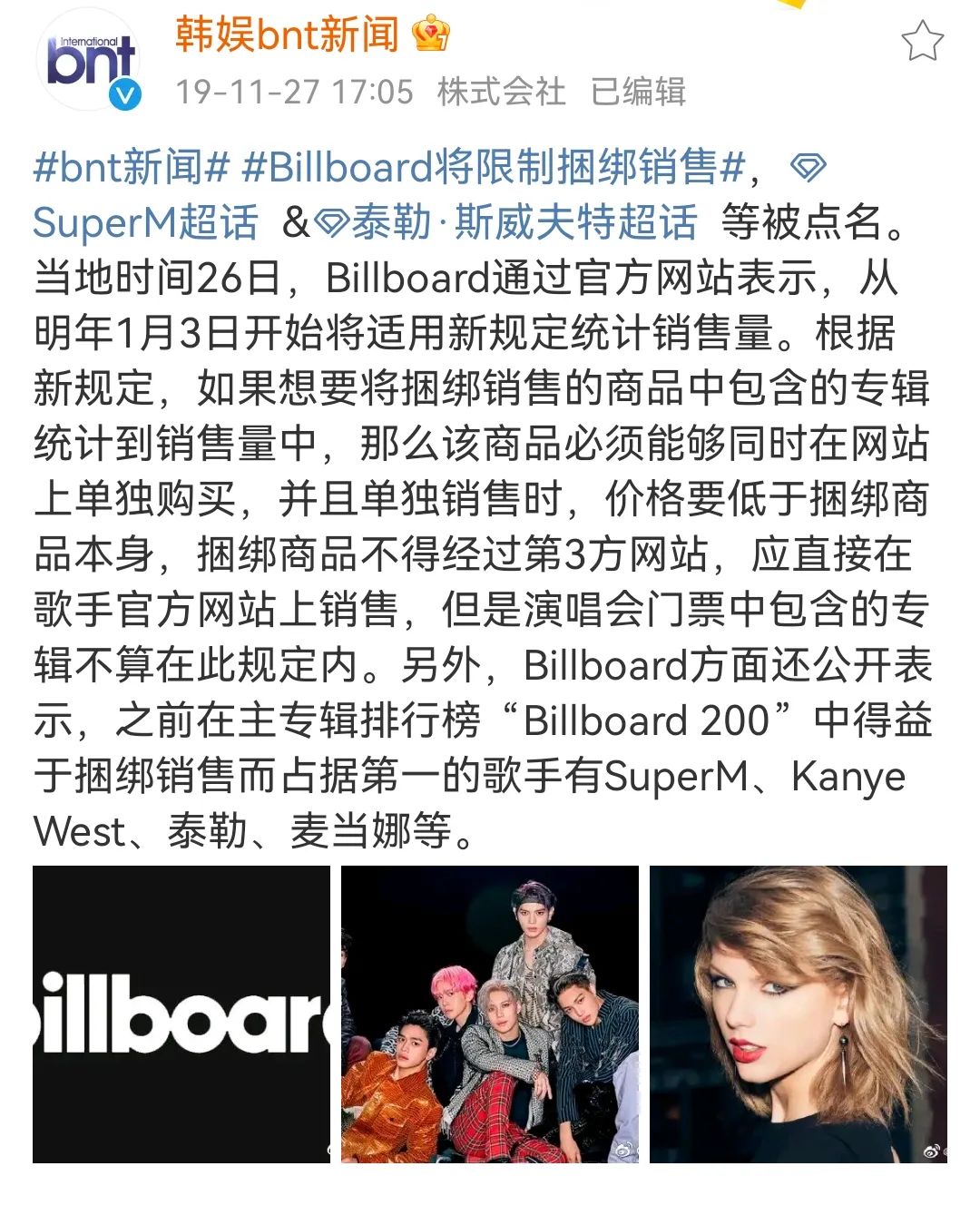 盡管這一行為相當(dāng)急功求成,但SM娛樂還沒有出色的闖美案例,以至于SuperM以“捆綁銷售”的方式繼續(xù)影響B(tài)illboard榜單,最終成為Billboard不得不改版榜單的因素之一。