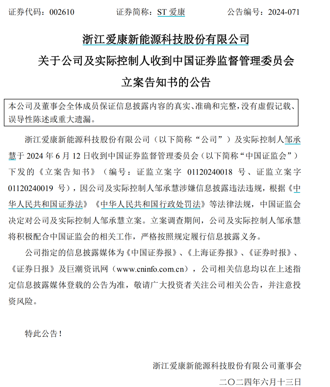 6月12日晚,ST愛(ài)康宣布,中國(guó)證監(jiān)會(huì)決定依法向公司和實(shí)際控制人鄒承慧立案,原因是公司和實(shí)際控制人鄒承慧涉嫌信息披露違法違規(guī)。