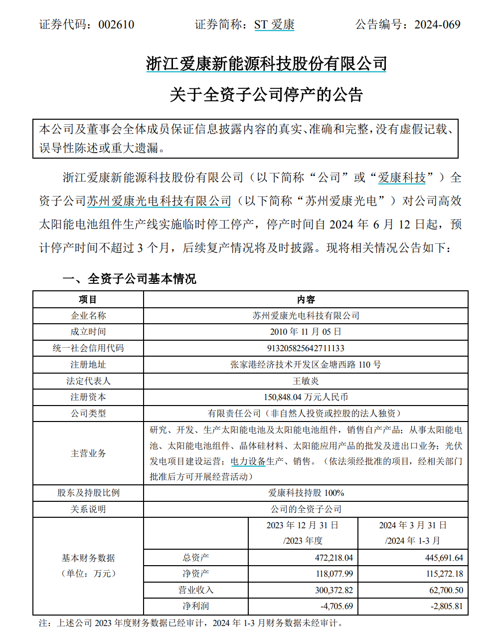六月十二日晚,ST愛(ài)康宣布,全資子公司蘇州愛(ài)康光電科技有限公司(以下簡(jiǎn)稱:蘇州愛(ài)康光電)暫停高效太陽(yáng)能電池組件生產(chǎn)線的生產(chǎn),從2024年6月12日起,預(yù)計(jì)停工時(shí)間不超過(guò)3個(gè)月。