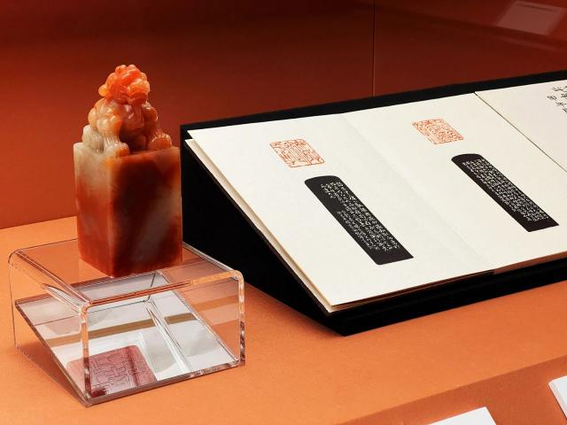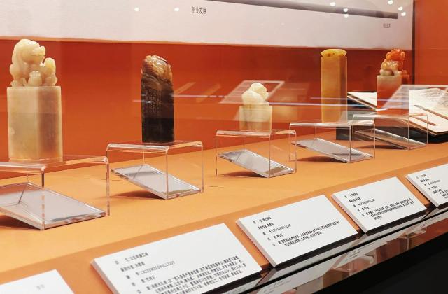 展覽廳內(nèi),以中國傳統(tǒng)家具儲物柜為原型的大書架,展示了寶璽、文人墨客的私章、個人收藏的閑印?!笆嗄昵?,我開始探索曾祖父的印章,漸漸地愛上了明清文人的印章,從此一發(fā)不可收拾。"展覽廳負責人劉亮說。他想和身邊的朋友分享印章的美,所以他努力學習“四位一體”的新理念印章,通過經(jīng)典的詩詞印章,呈現(xiàn)人生各個階段的重要行跡和格言。