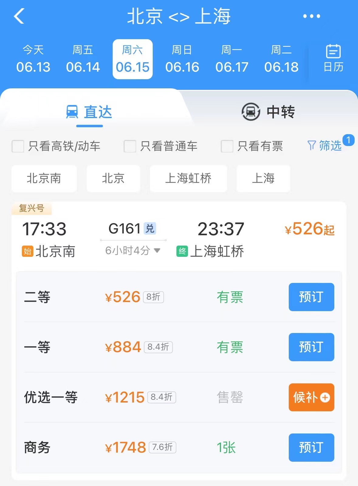 6月13日,ThePapp查詢鐵路12306APP發(fā)現(xiàn),6月14日和15日,上海虹橋站來回北京南站的一些班次新增了“首選一等座”選項,但有些班次已經(jīng)售罄。