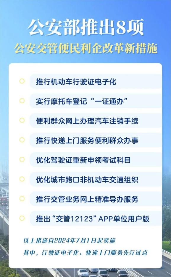 ◆ 公安部將于7月1日起實(shí)施8項(xiàng)公安交管便民利企改革新措施。